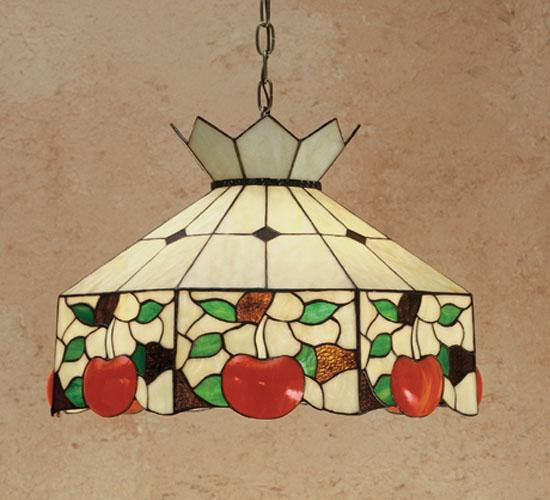 Bite into this delightful stained glass shade bordered with ripe luscious three dimensional crimson apples with grass green leaves and sparkling bark brown accents. Enhance you home with this meyda tiffany original classic design on a cream background with brown granite diamonds. The chain and canopy are hand finished in mahogany bronze.