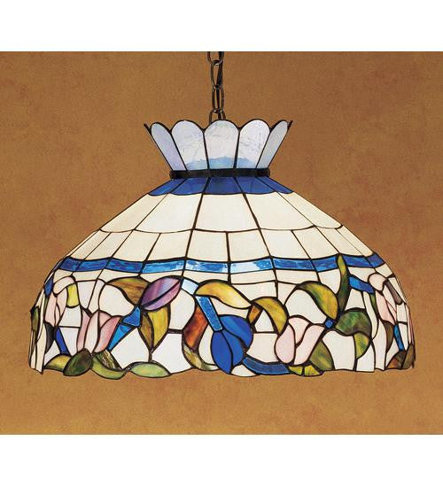 The unique color variations of stained art glass are the perfect complement to popular nature themes of copperfoil shades. A virtual flower garden of glass, in pink, periwinkle, and mauve, is featured on a white grid patterned shade which is offered on mahogany bronze finished hardware.