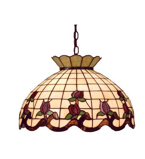 Grace your home with this elegant crowned shade, featuring a gridwork of bone beige glass, adorned with a rootbeer granite border of swirling ribbons and perfect burgundy rosebuds. The tiffany style stained glass pendant is made of hand cut and copperfoiled glass and is suspended from mahogany bronze, hand finished chain and canopy.